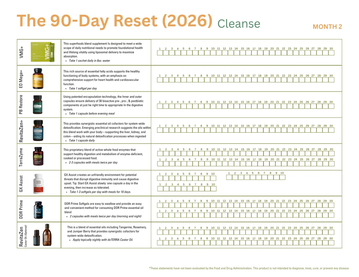 doTERRA 90-Day Reset is a supportive, simple way to kickstart your wellness goals for the new year. It’s designed to help you focus on healthy habits, reset your body’s rhythms, and feel your best over a 90-day period. The program combines key essential oils, supplements, and daily wellness tools to support digestion, energy, and overall vitality—perfect for anyone looking to start the year feeling renewed and balanced. It’s a great opportunity to build consistency in your health routine while taking advantage of special promotions and products to set yourself up for success.