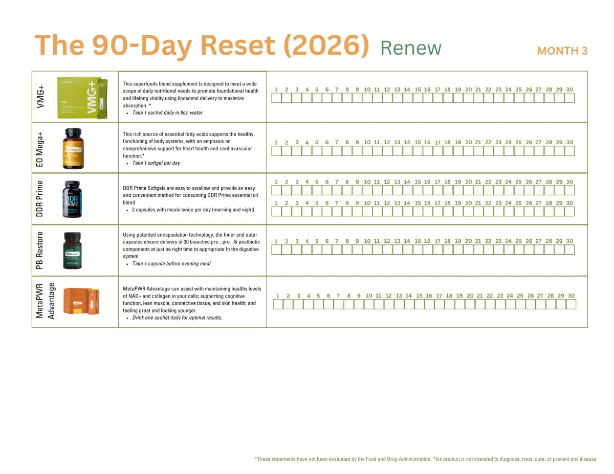 Month 3 of the doTERRA 90-Day Reset is all about renewing and rebuilding—helping you solidify the progress you’ve made and continue supporting your body’s natural wellness in a gentle, sustainable way. After preparing your system in Month 1 and supporting natural cleansing in Month 2, this final phase focuses on nourishing your cells, fortifying metabolic health, and stabilizing your body’s detox gains so you feel stronger and more balanced overall. The Month 3 kit typically includes foundational wellness supplements you’ve been using (like VMG+, EO Mega+, PB Restore, and DDR Prime) along with MetaPWR Advantage, which helps support healthy metabolism, cellular energy, and overall vitality as you continue building healthy habits. In short, Month 3 helps you finish strong—bringing nourishment, resilience, and stability to your reset journey so you can feel confident in your progress and continue thriving.💛