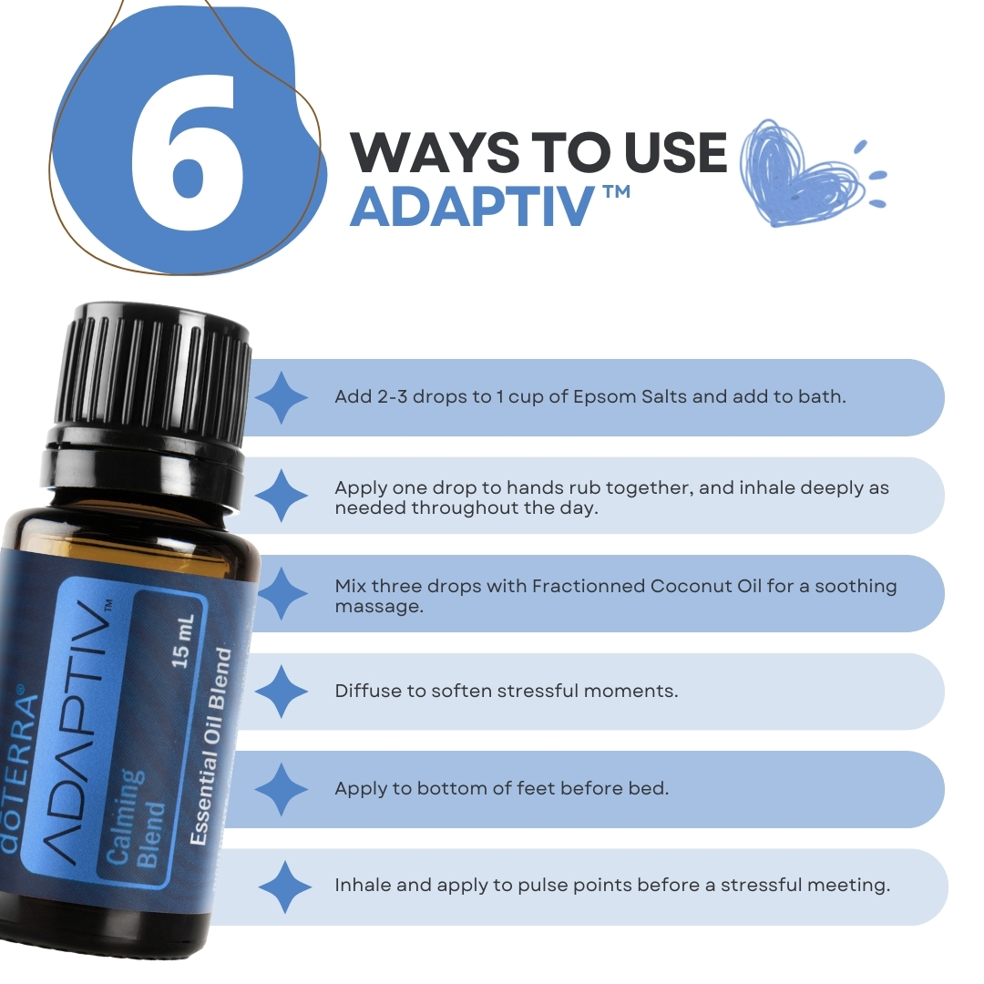 Adaptiv is basically your “take-a-deep-breath” oil in a bottle. It’s a calming blend that helps your mind and body shift out of stress mode and back into “I’ve got this” mode. I love using it on days when life feels a little louder than usual—it’s gentle, supportive, and smells like a peaceful vacation. A few easy, everyday ways to use it: Diffuse it when the house feels chaotic or you need a calming reset Roll or rub it on your wrists/neck before a busy day or stressful moment Put a drop in your palms, breathe in, and exhale slowly when your brain feels overloaded Add it to Epsom salts for a relaxing evening bath Pair it with Adaptiv Softgels for extra emotional support on high-stress days Adaptiv makes it simple to create little moments of calm—right in the middle of real life. Let me know if you want more ideas!